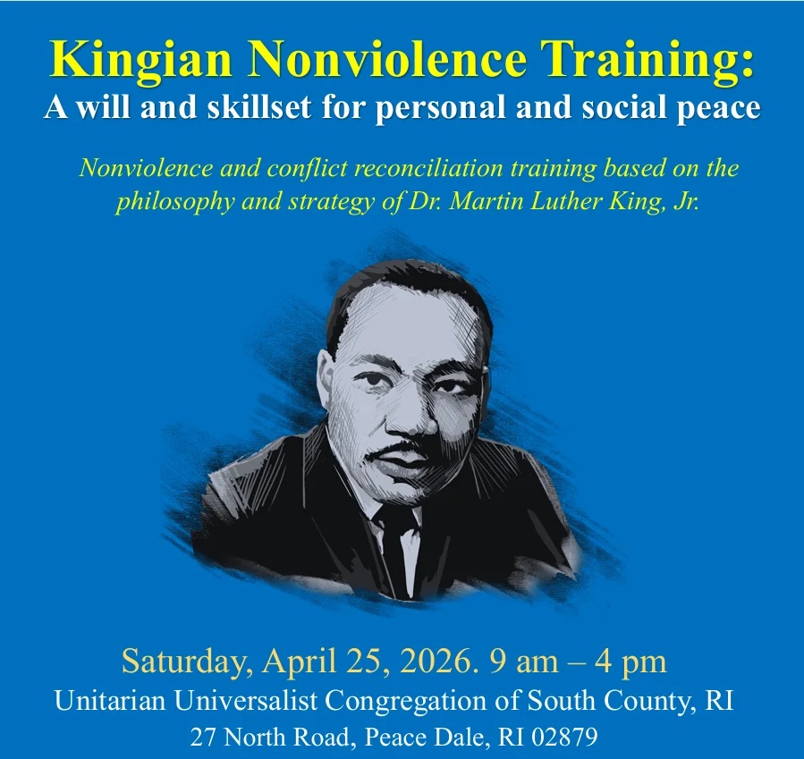 Kingian Nonviolence Training. Sat. April 25,2026, 9am-4pm. Unitarian Universalist Congregation of South County, 27 North Road, Peace Dale, RI 02879